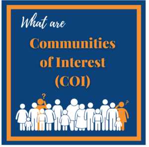 A Community of Interest (COI) is a group of people that: live in a geographically definable area, share common social or economic interests, and should be included within a single district for purposes of effective and fair representation in future elections.