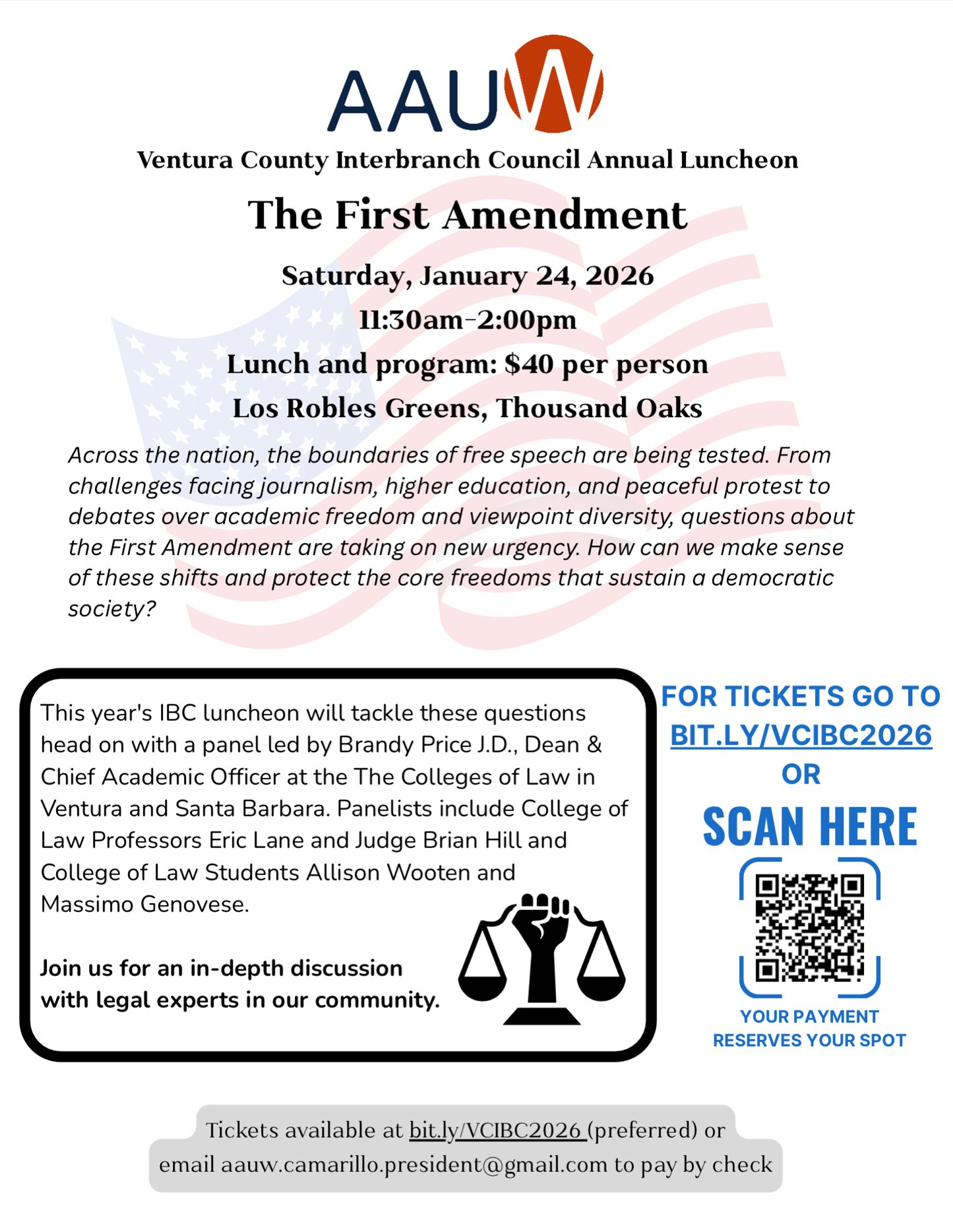 Saturday, January 24, 11:30 am - 2 pm - AAUW First Amendment Panel & Luncheon at Los Robles Greens, 299 S Moorpark Rd, Thousand Oaks, CA 91361 - More Information