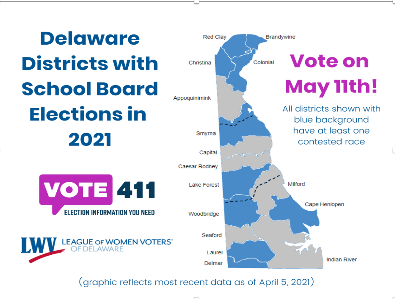 The League of Women Voters of Delaware has published a user-friendly guide to the state’s May 11 school board elections in hopes of reversing the historically poor turnout at these elections, which typically bring out only ten percent of eligible voters. This is greatly troublesome considering the importance of this position. School boards not only shape and monitor education policies, but their decisions influence property taxes, home values, and government budgets, as well as address racial equity issues. During the COVID pandemic, school boards played an important role in addressing school safety issues.