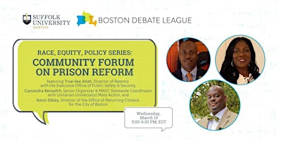 Together with our partners at Suffolk University, we are excited to announce the third community forum in our Race, Equity, Policy Series, a year-long series of dialogues and learning opportunities for students and the broader community focusing on this year's debate topic: Criminal Justice Reform.