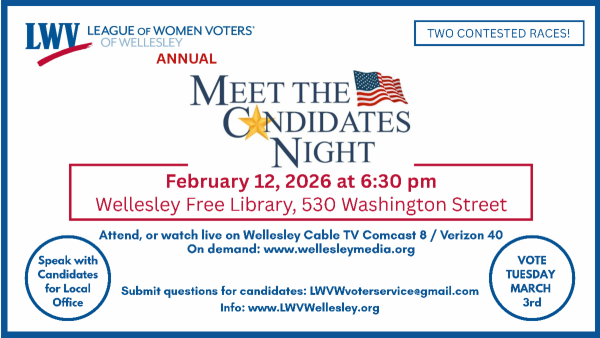 Share: Thursday, February 12, 2026 - 6:30pm to 8:00pmAdd to CalendariCalendar Outlook Google Yahoo Meet the Candidates Night Thursday, February 12, 6:30-8PM Wakelin Room, Wellesley Free Library Share: