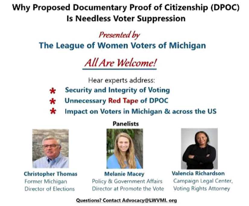 The public is welcome to join LWVMI for a Zoom panel presentation.  Panelists will discuss why Documentary Proof of Citizenship (DPOC) is needless voter suppression and what we can do to stop it. Zoom link is       https://us02web.zoom.us/meeting/register/ZfQFdcF4R32HB7MpzfaA5w#/registration