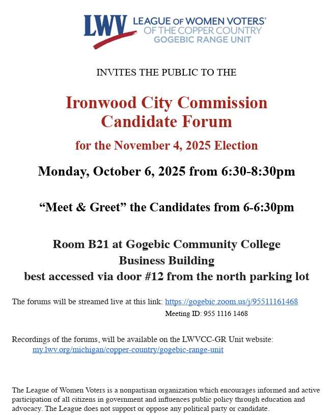 Ironwood City Commission Candidate Forum by Gogebic Range Unit on October 6, 2025, can be viewed here: